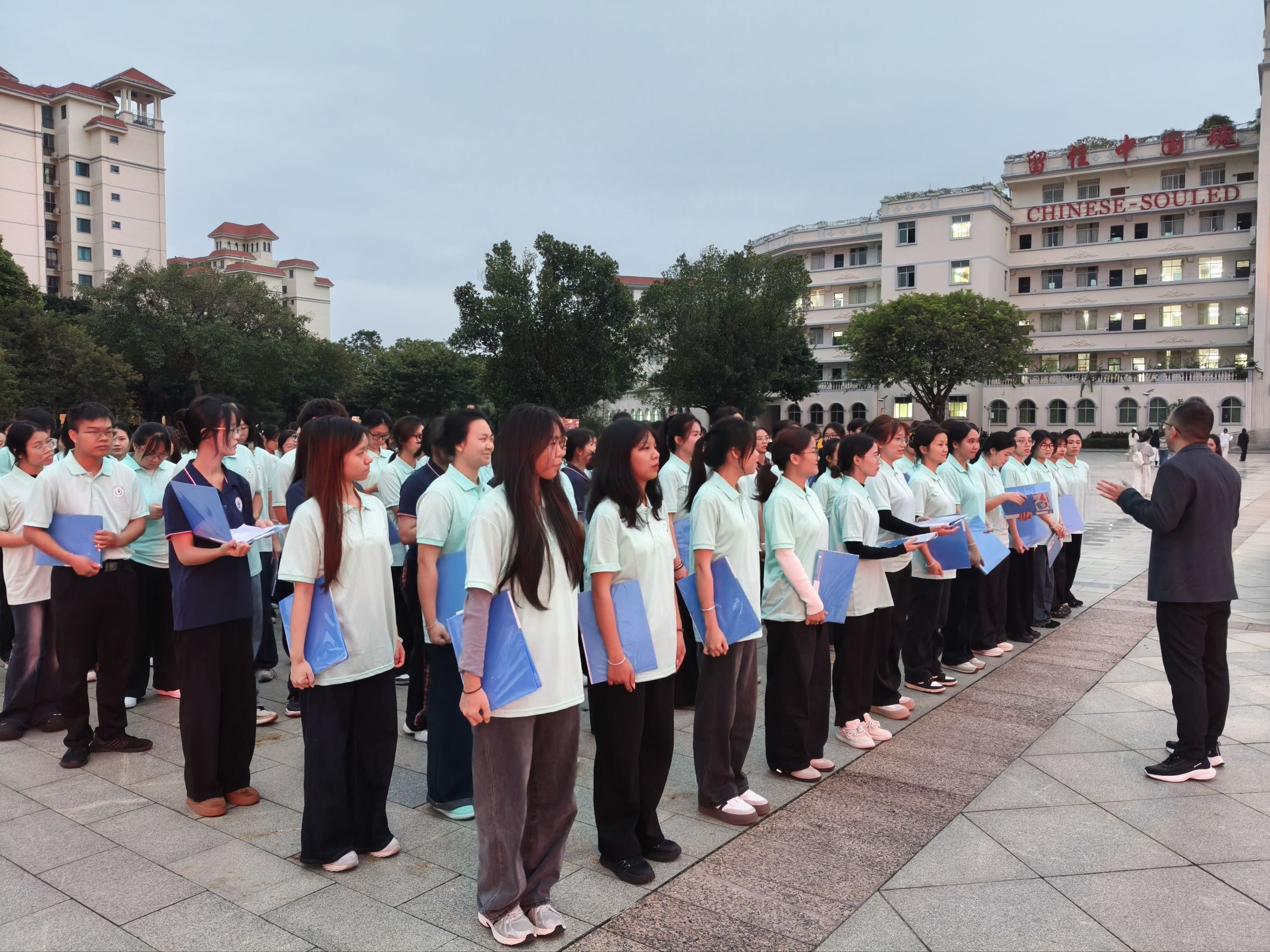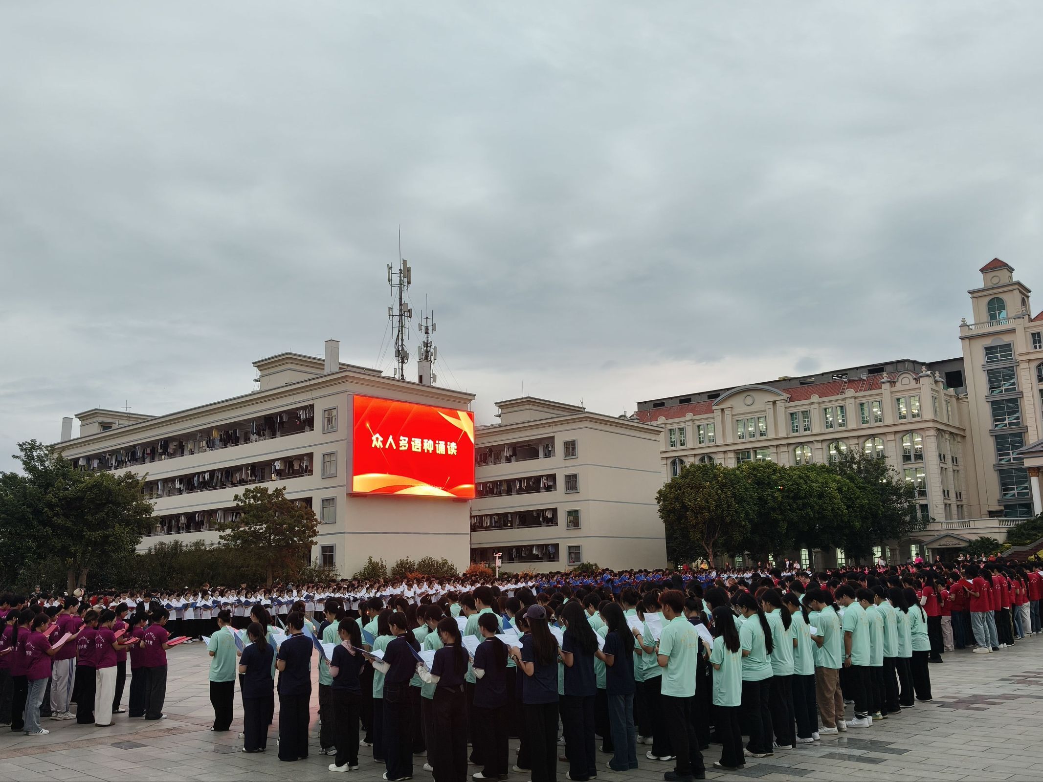 活动现场,大智广场氛围庄重而热烈。各学院学子朗诵字正腔圆,将华夏五千年文明的厚重与新时代发展的辉煌娓娓道来;英语、泰语等语种的诵读则以国际化表达,让“生于华夏”的自豪感跨越语言界限。