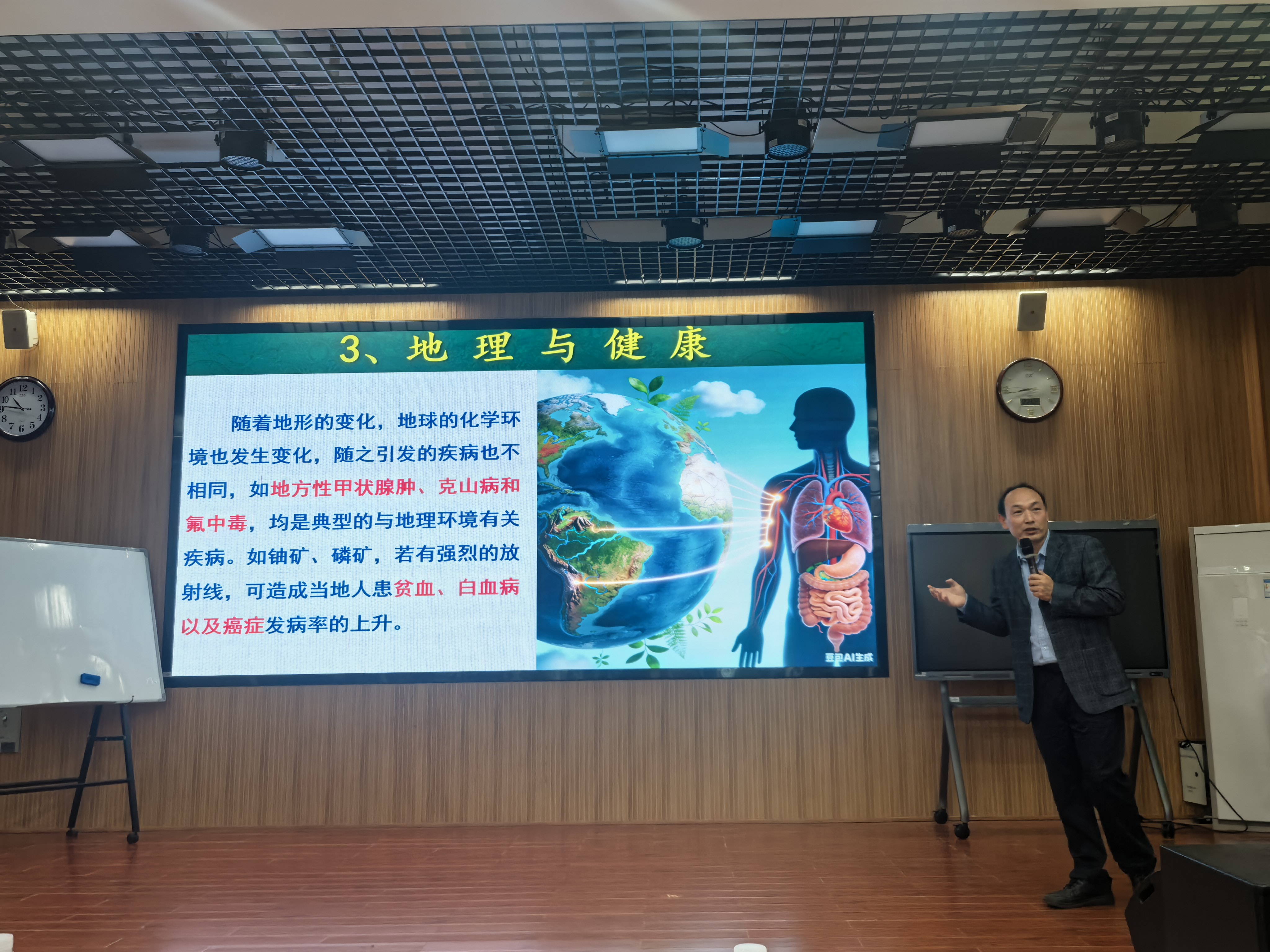 讲座中,刘鹏教授系统阐释了阳光、空气、地理等环境要素与人体健康的深层联系。他从《黄帝内经》“天人相应”思想出发,结合现代环境医学研究,科学揭示了环境影响健康的客观规律。同时,他分享了森林浴、居室光照优化、通风与污染控制等自然疗法与实用技巧,为听众提供了贴近生活的健康改善方案。