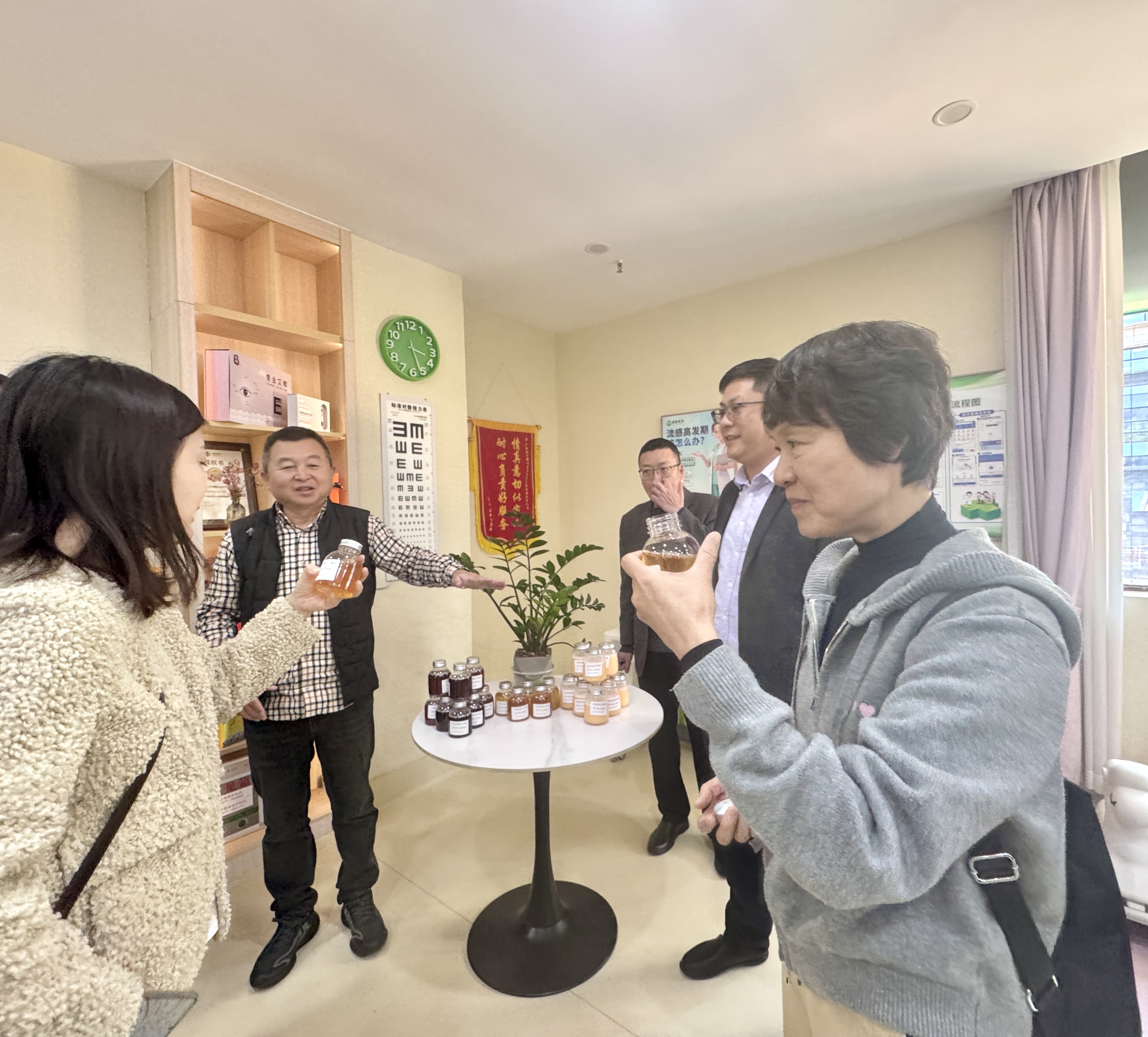 图为学院领导于德心医养桂雅综合门诊部体验健康饮品