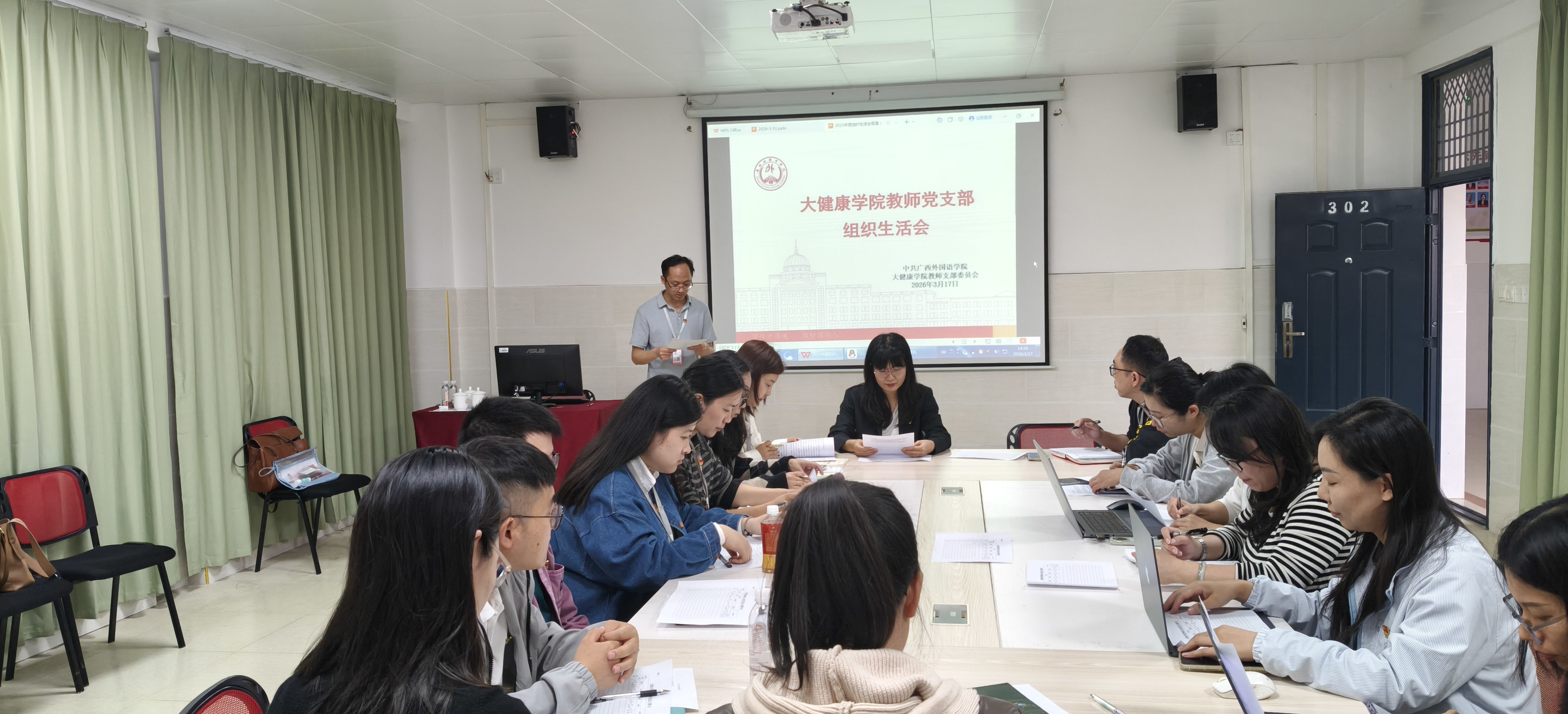 为深入学习贯彻习近平新时代中国特色社会主义思想和党的二十届四中全会精神,巩固深化党纪学习教育成果,2026年3月17日,大健康学院教师党支部在笃行楼302会议室召开2025年度组织生活会并开展民主评议党员工作。会议由教师党支部书记覃娜同志主持,支部全体党员参加。