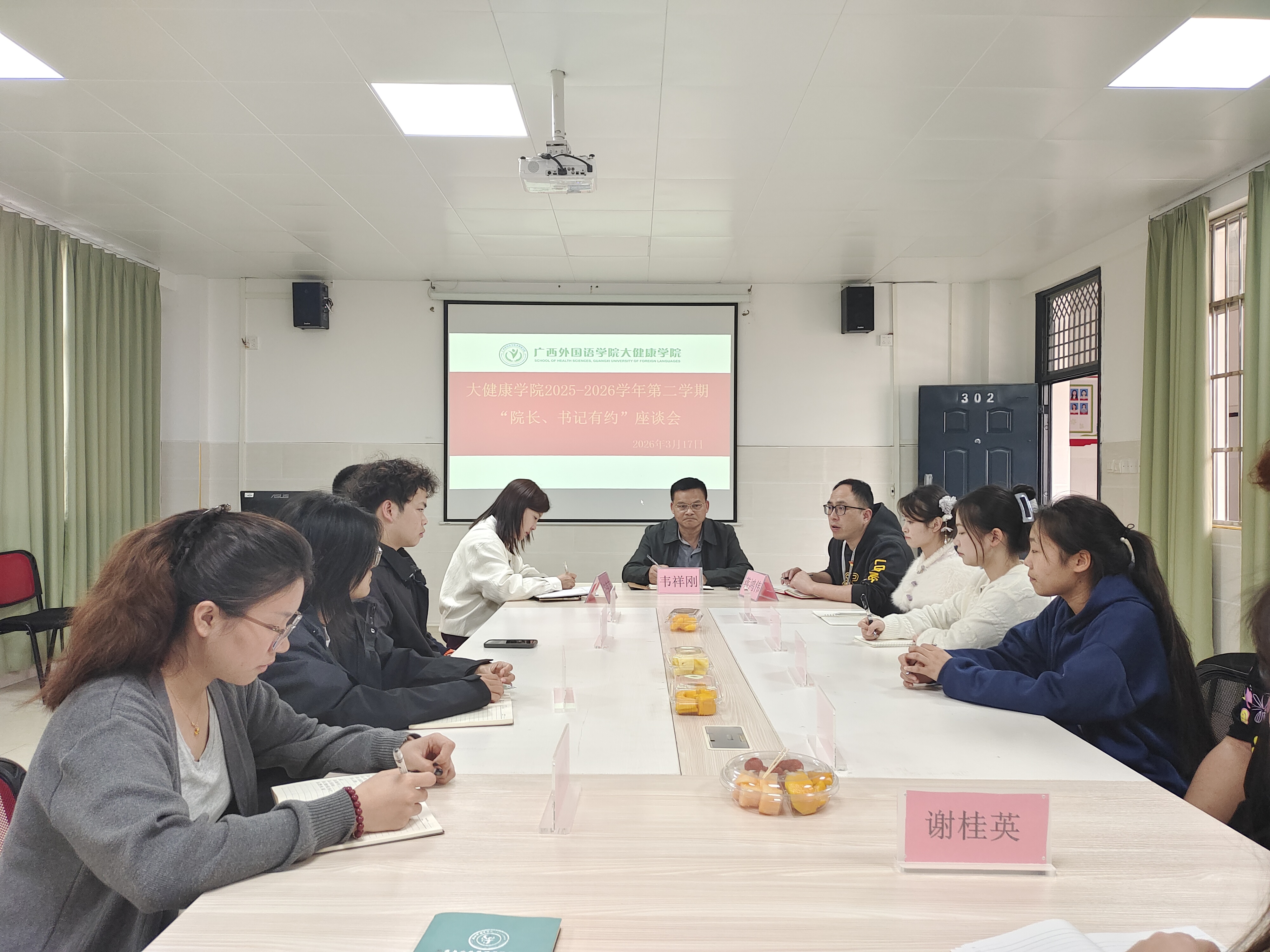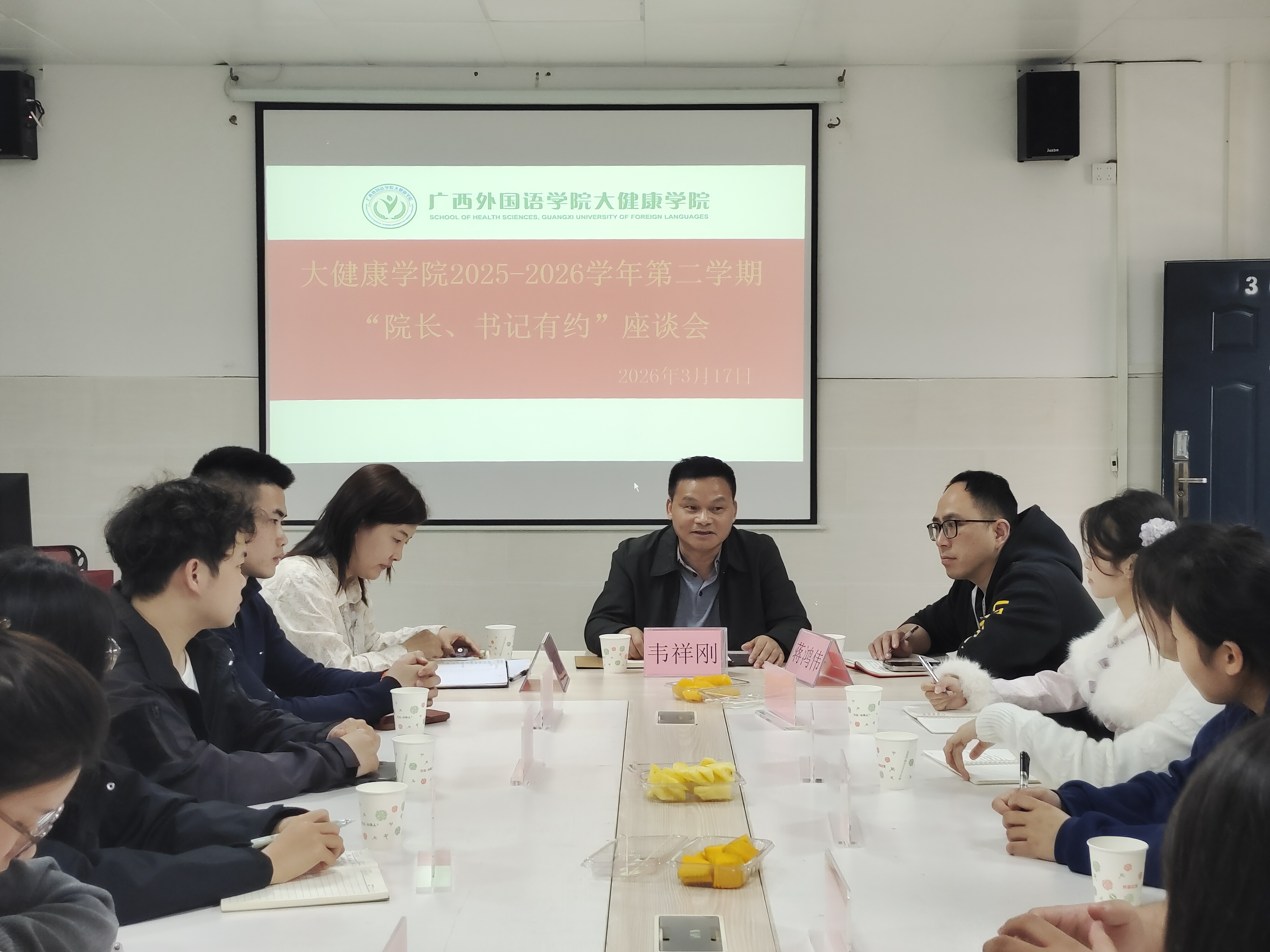 为深入践行“以生为本”的育人理念,精准对接学生成长需求,畅通师生沟通渠道,切实解决学生在学习、生活中的实际困惑,大健康学院“院长、书记有约”座谈会于3月17日在笃行楼302顺利举行。学院院长韦祥刚教授、学院党总支书记谷苗苗同志、副书记蒋鸿伟同志与来自各年级的学生代表齐聚一堂,面对面交流、心贴心沟通,共话成长、共谋发展。