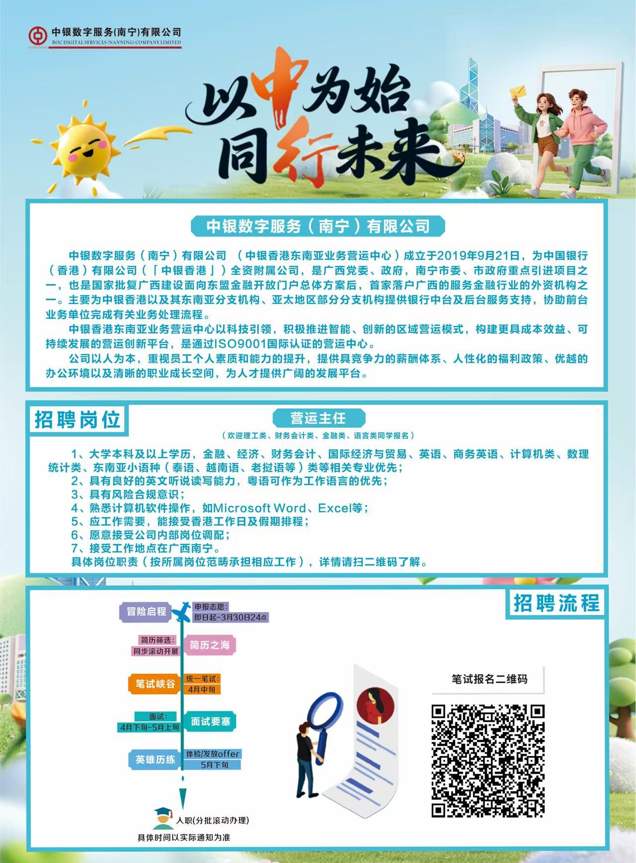 中银香港东南亚业务营运中心(注册名:中银数字服务(南宁)有限公司)成立于2019年9月21日,为中国银行(香港)有限公司(「中银香港」)全资附属公司,是广西党委、政府,南宁市委、市政府重点引进项目之一,也是国家批复广西建设面向东盟金融开放门户总体方案后,首家落户广西的服务金融行业的外资机构之一。主要为中银香港以及其东南亚分支机构、亚太地区部分分支机构提供银行中台及后台服务支持,协助前台业务单位完成有关业务处理流程。
