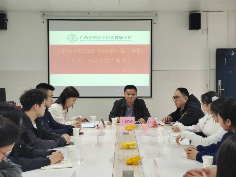 为深入践行“以生为本”的育人理念,精准对接学生成长需求,畅通师生沟通渠道,切实解决学生在学习、生活中的实际困惑,大健康学院“院长、书记有约”座谈会于3月17日在笃行楼302顺利举行。学院院长韦祥刚教授、学院党总支书记谷苗苗同志、副书记蒋鸿伟同志与来自各年级的学生代表齐聚一堂,面对面交流、心贴心沟通,共话成长、共谋发展。